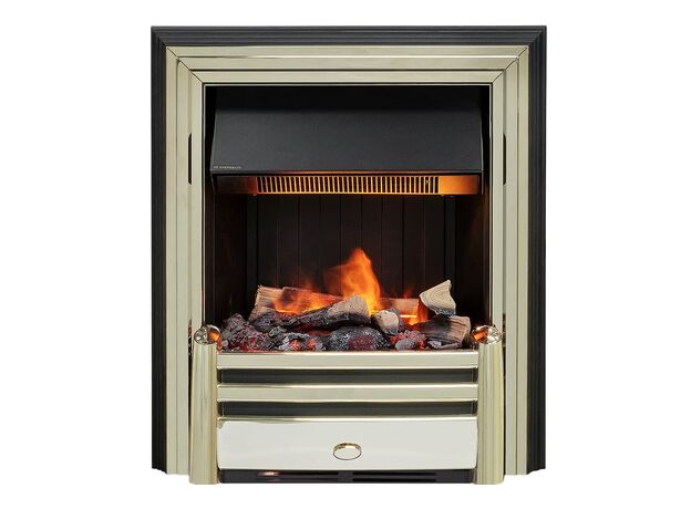 Электрокамин выполнен в золотом цвете. Золото – это материал, который никогда не выйдет из моды, это свидетельство безупречного вкуса и верности традициям. Цвет золота подчёркивает неповторимый стиль и необычность этого камина. К очагу можно подобрать любой портал, который подойдет к вашему интерьеру и станет его лаконичным продолжением. В очаге Dimplex Cavendish применяется эффект «живого» пламени Opti-Myst, в основу которого заложен инновационный принцип имитации огня - в очаге мерцает пламя, практически неотличимое от настоящего. В камине используется муляж дров ручной работы, которые невозможно отличить от настоящих поленьев, а благодаря подсветке создается полная имитация жарко пылающего очага.