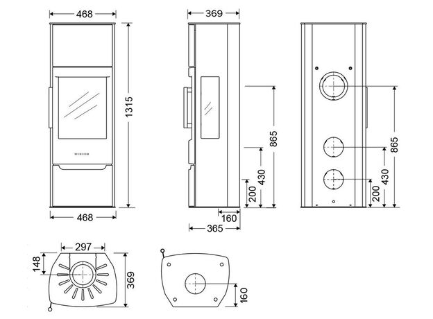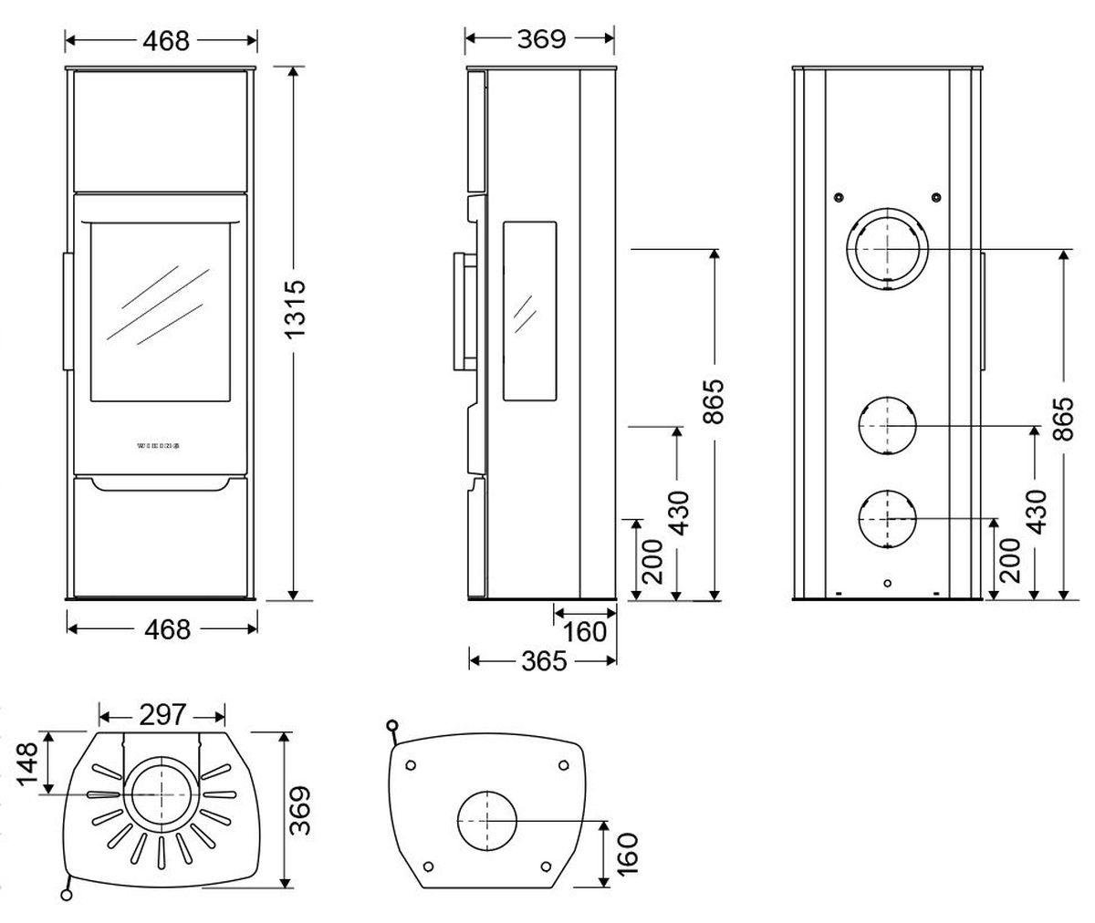 Мощность печи от 3 до 8 кВт позволяет легко и эффективно отопить площадь от 20 до 80м². Номинальная мощность — 5кВт дана производителем как средняя, в ней печь работает в оптимальном режиме и в максимальном КПД.
